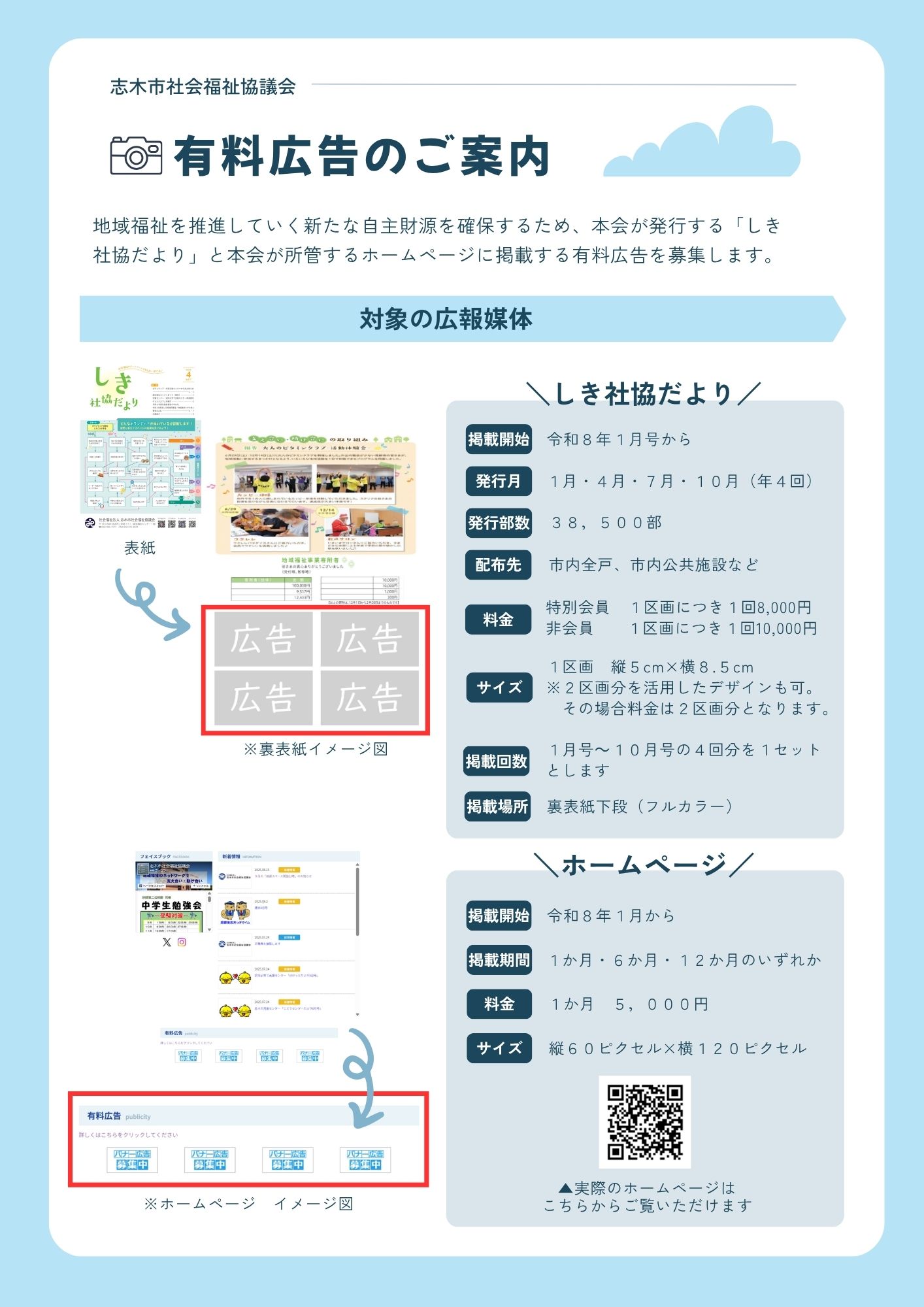 地域福祉を推進していく新たな自主財源を確保するため、本会が発行する「しき社協だより」と本会が所管するホームページに掲載する有料広告を募集します。