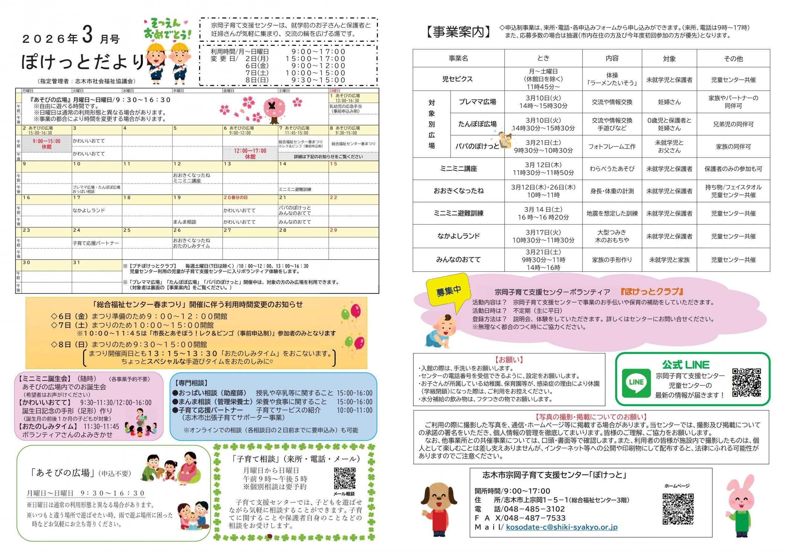 ぽけっとだより3月号 宗岡子育て支援センター バックナンバーもありますので、ご覧ください。