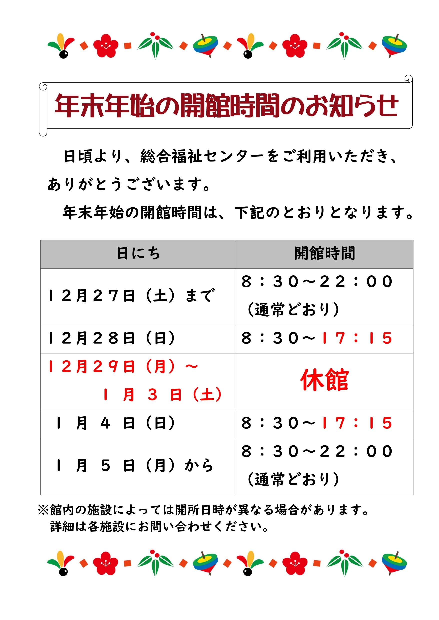総合福祉センターの年末年始の開館状況について、以下のとおり変更となりますので