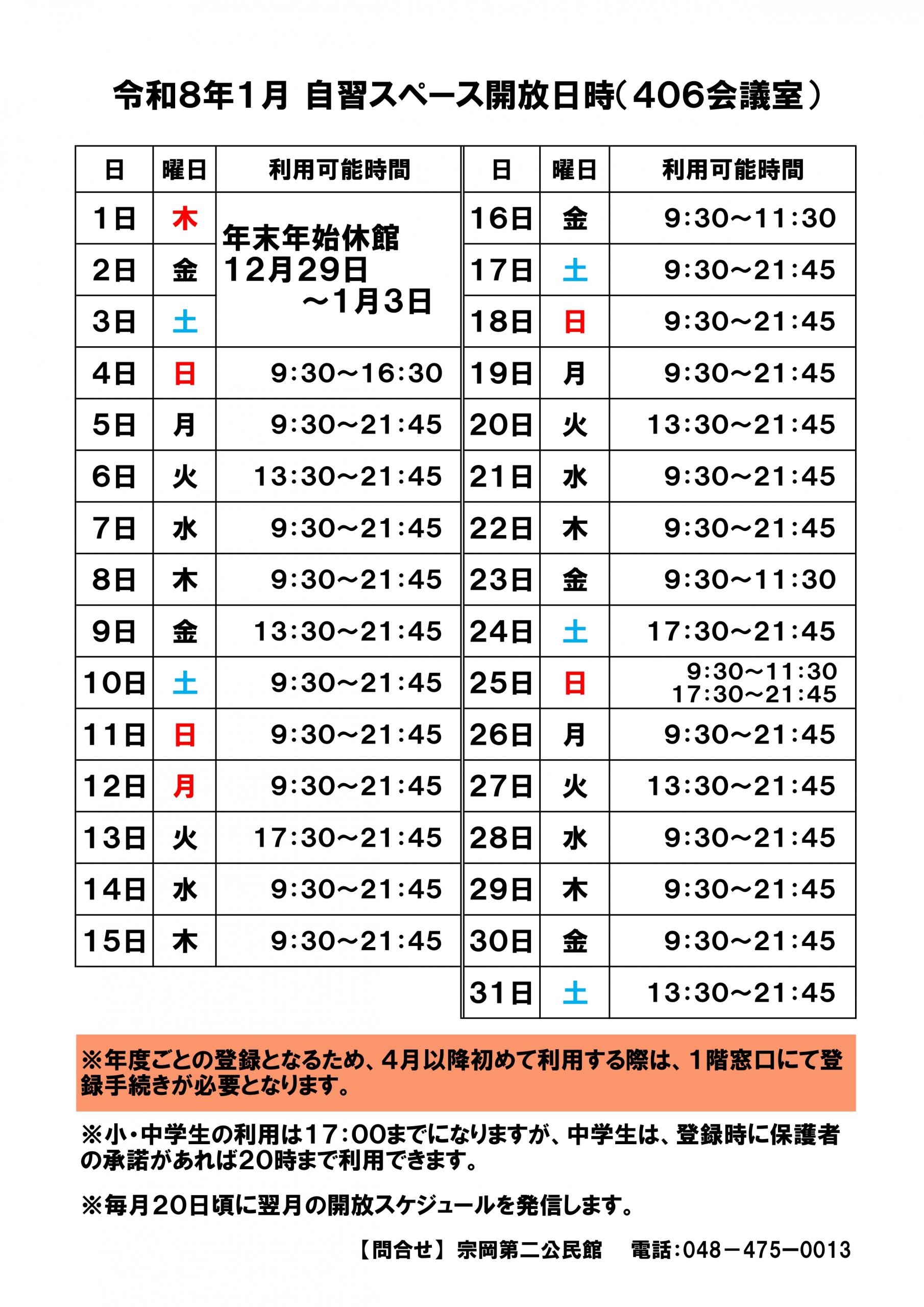 宗岡第二公民館(総合福祉センター内)から1月の自習スペース開放日時をお知らせいたします。開放日時は、志木社協のFacebook、X、Instagramでも発信しますので、ぜひご登録ください。