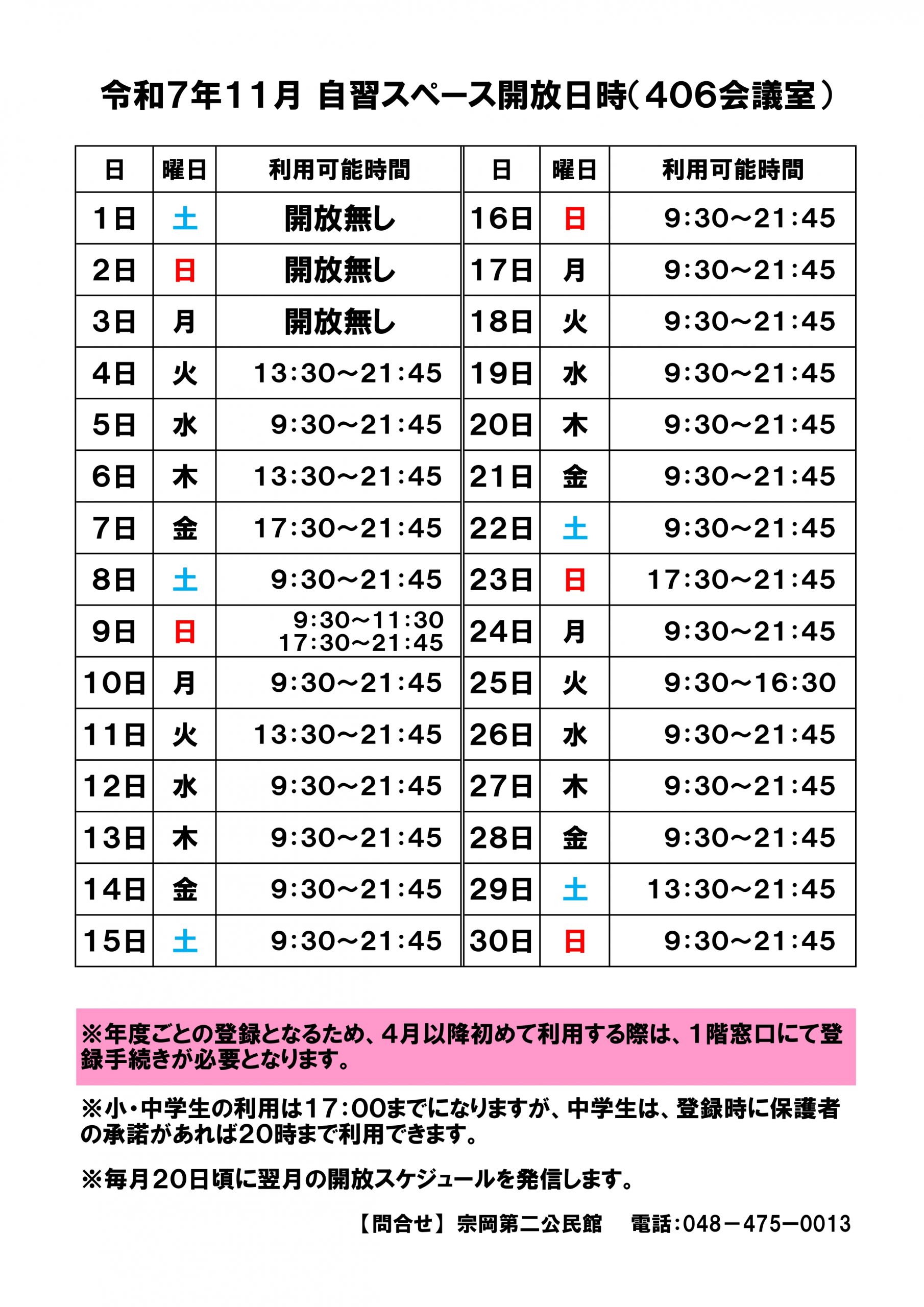 宗岡第二公民館(総合福祉センター内)から11月の自習スペース開放日時をお知らせいたします。開放日時は、志木社協のFacebook、X、Instagramでも発信しますので、ぜひご登録ください。