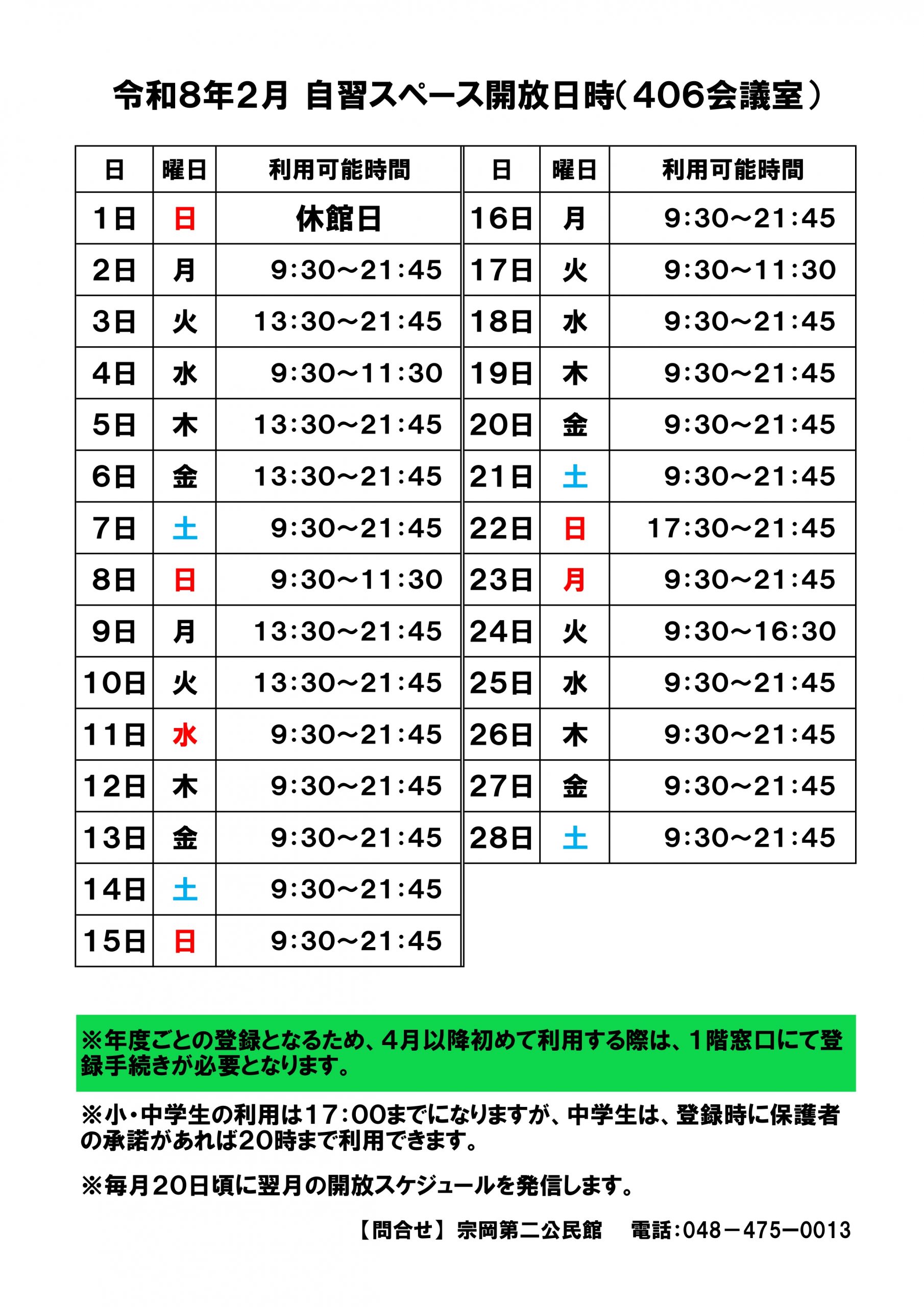 宗岡第二公民館(総合福祉センター内)から2月の自習スペース開放日時をお知らせいたします。開放日時は、志木社協のFacebook、X、Instagramでも発信しますので、ぜひご登録ください。
