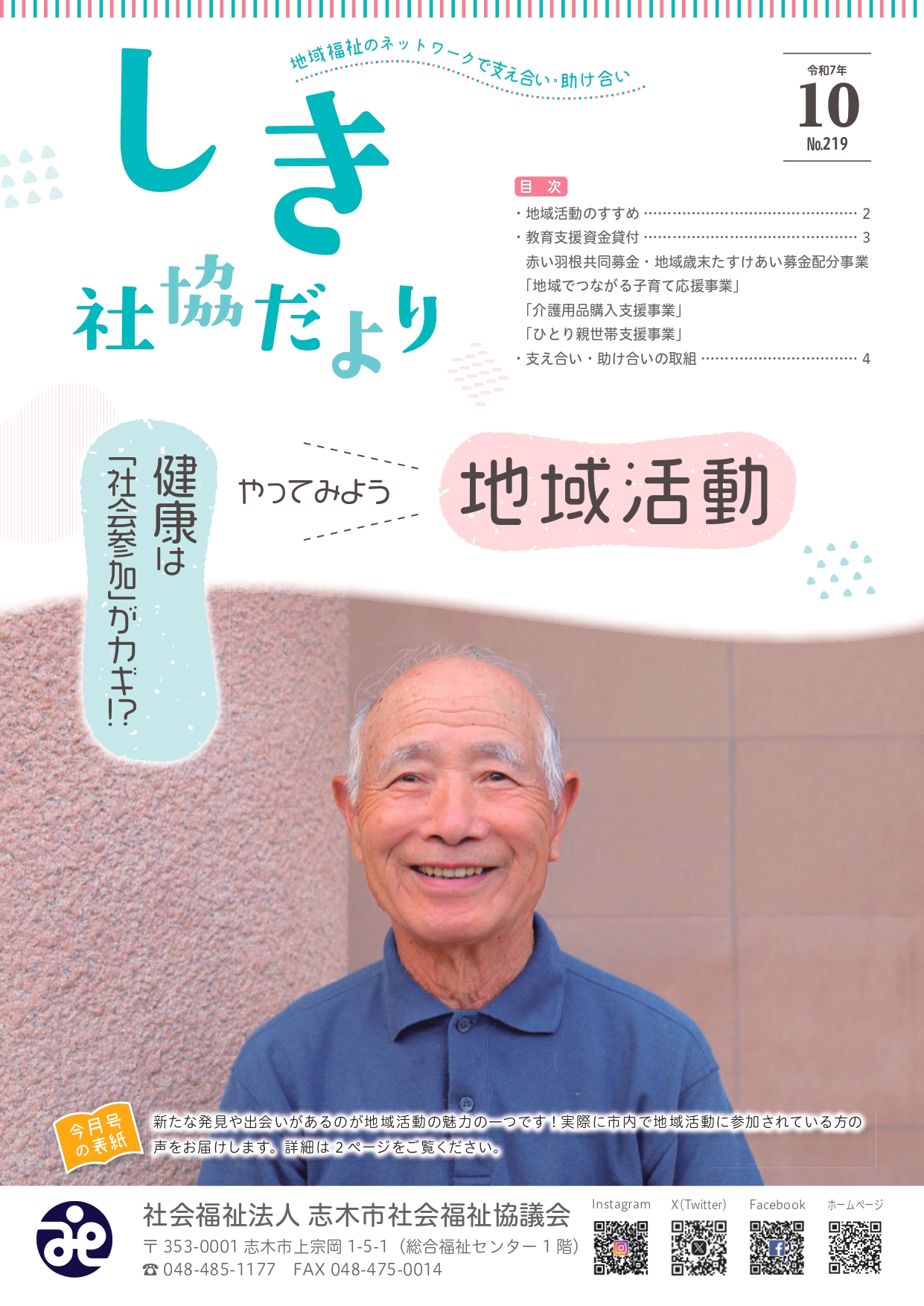 令和7年10月発行 | ≪表紙・2頁≫ 地域活動のすすめ ≪3頁≫ 教育支援資金貸付 赤い羽根共同募金・地域歳末たすけあい募金配分事業 「地域でつながる子育て応援事業」 「介護用品購入支援事業」 「ひとり親世帯支援事業」 ≪4頁≫ 支え合い・助け合いの取組 |